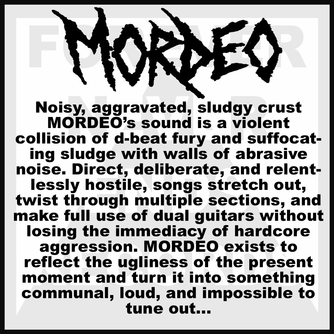 Noisy, aggravated, sludgy crust MORDEO’s sound is a violent collision of d-beat fury and suffocating sludge with walls of abrasive noise. Direct, deliberate, and relentlessly hostile, songs stretch out, twist through multiple sections, and make full use of dual guitars without losing the immediacy of hardcore aggression. MORDEO exists to reflect the ugliness of the present moment and turn it into something communal, loud, and impossible to tune out